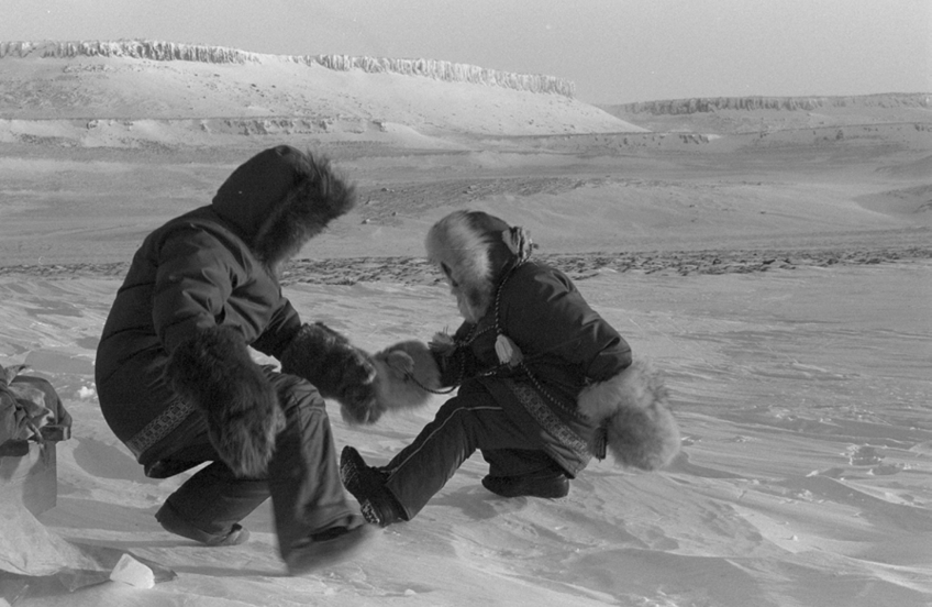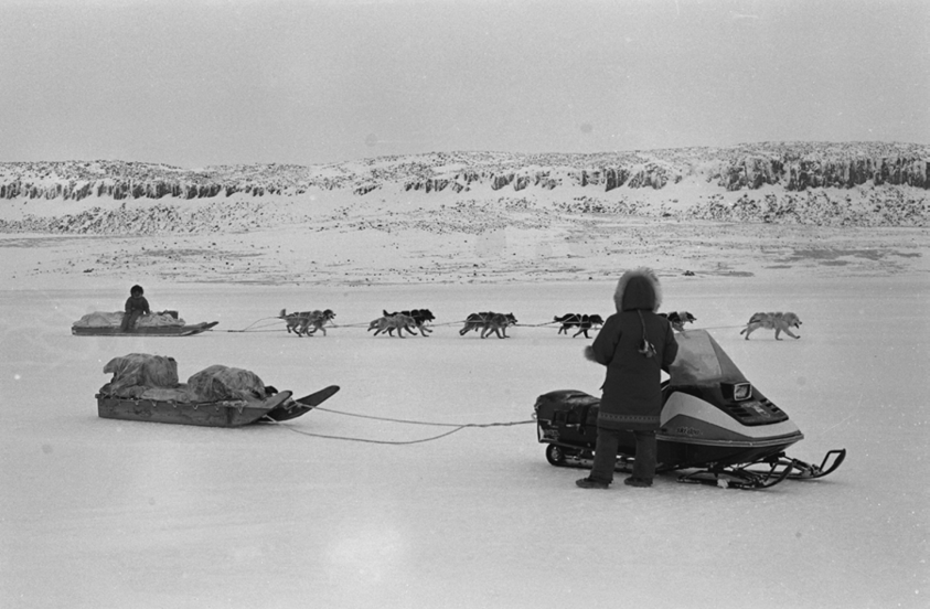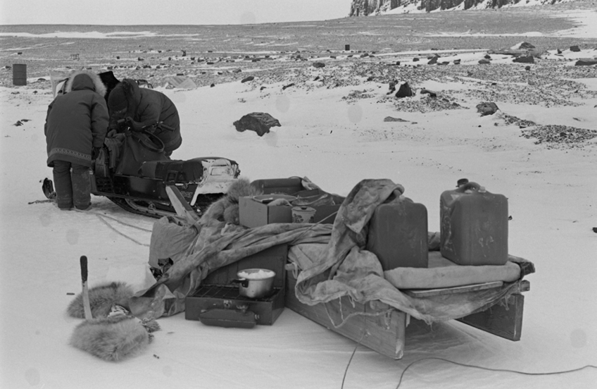 We travelled in a kamotik. I wanted to show the knife, the stove, the gasoline, and the two women hunched over the snowmobile that needs a fix up.