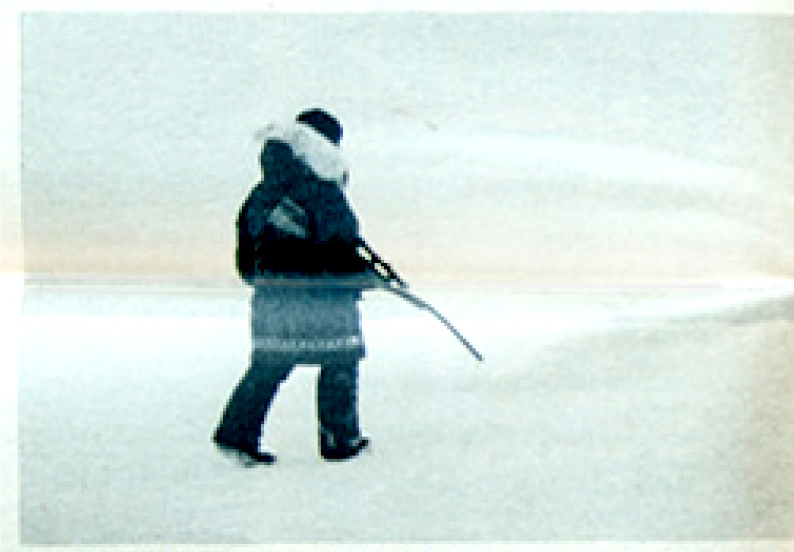 Ida said: 'Do you want to come seal hunting with me?' Yes! She walked up to the edge of the ice floe with her gun, looking for a seal. The image is almost a silhouette.