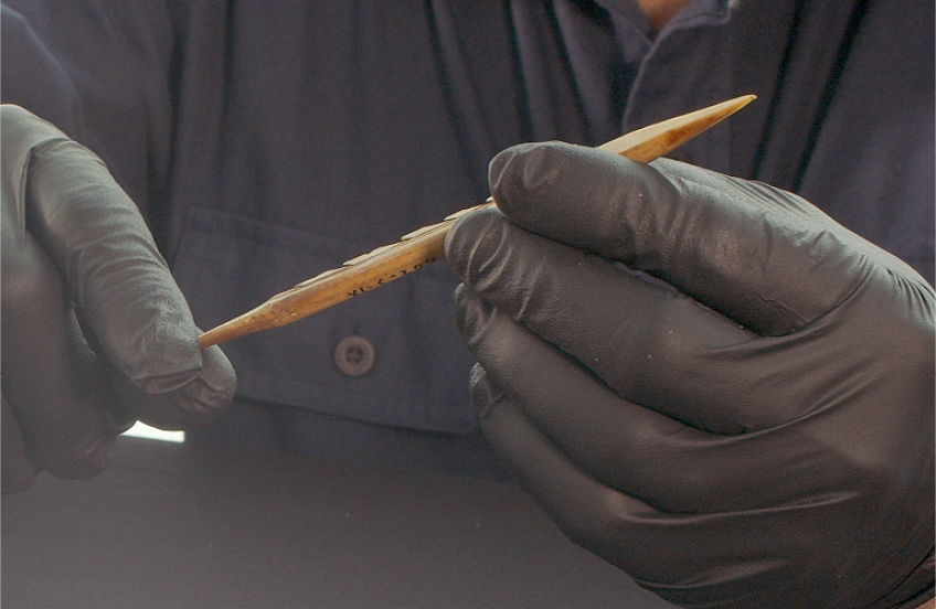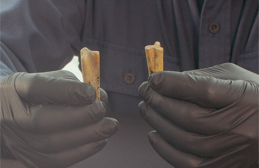 This toy is a bone-and-pin game, made from the toe bone of a caribou. The end was cut off, hollowed out and whittled into a triangular shape. People had fun then, too!"